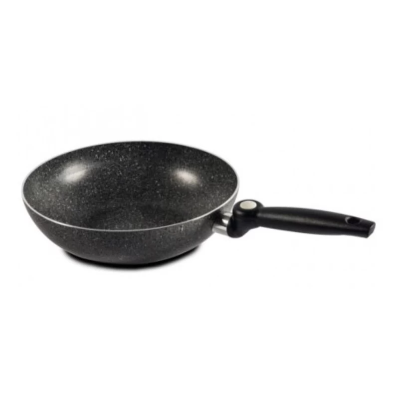 Wok de ø 28 cm de diamètre fabriqué en aluminium avec poignée (manche) repliable pour faciliter le rangement et surface anti-adhésive, équipement BIALETTI dédié pour le camping, le bateau, camping-car, van ou fourgon aménagé et caravane.