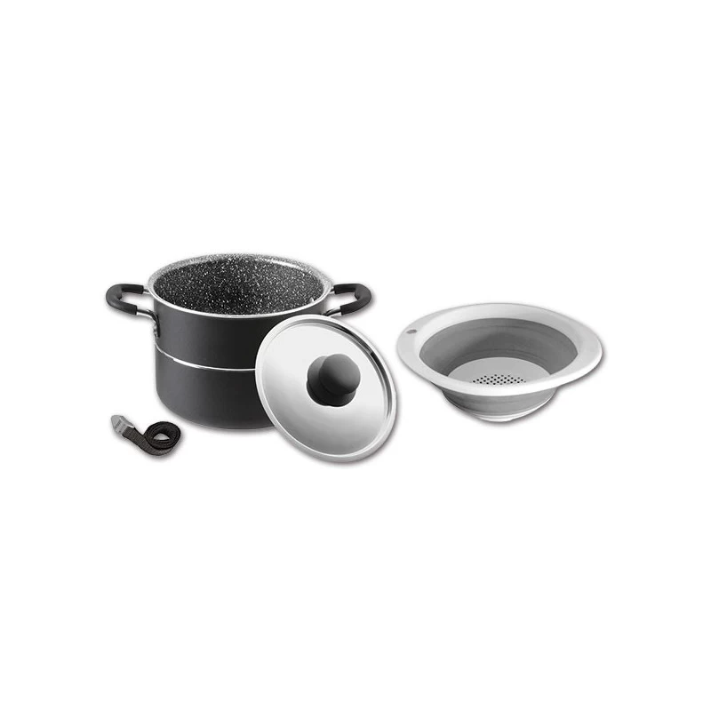 Composé du strict nécessaire, le set pirate de chez BRUNNER contient une casserole haute avec 2 poignées larges qui vous permettrons de faire cuire pâtes, riz ou tout autre condiment. Avec cette casserole, vous aurez un couvercle mais également une passoire en silicone qui se replie.
