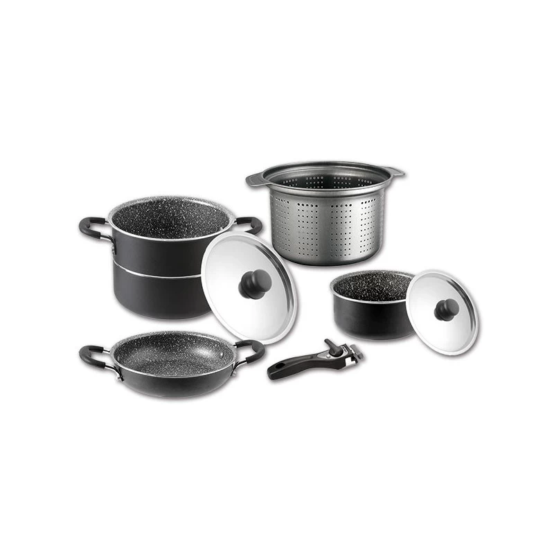– Fait-tout, couvercles, passoire, casserole, poĂŞle, poignĂ©e et sangle