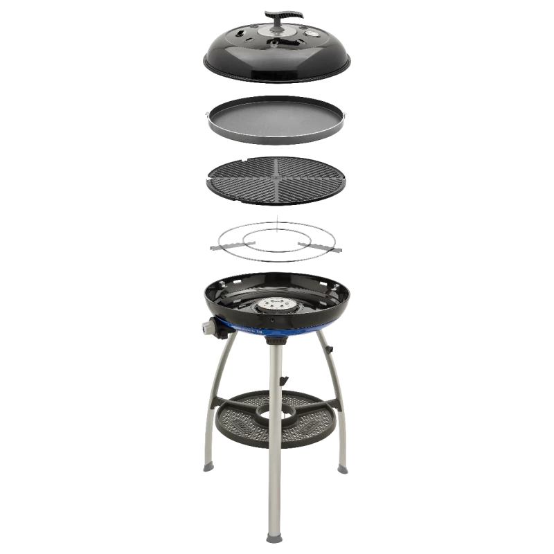 Accessoire pour camping-car de qualité, en standard le barbecue est équipé d’une cloche conçue pour accélérer la cuisson et limiter les désagréments de fumés et de graisses (pour les voisins, c’est aussi sympa). Avec ses trois pieds, le Carri Chef 50 atteint une hauteur de 93 cm permettant de cuisiner sans ce casse le dos ! Pour tout cuire, la viande, les légumes et le poisson, ce modèle est livré en standard avec ces pieds, support casserole et cloche.