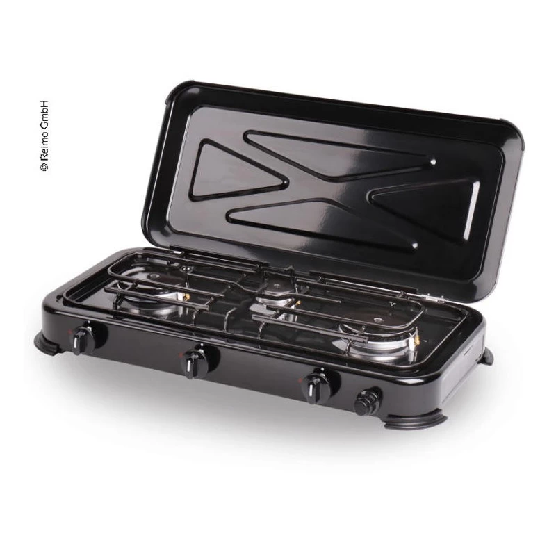 Le Mary 3 de CAMP4 est un rĂ©chaud gaz Ă 3 feux avec couvercle et allumage piezo pour l’Ă©quipement du fourgon amĂ©nagĂ©, camping-car et la cuisine de camping.