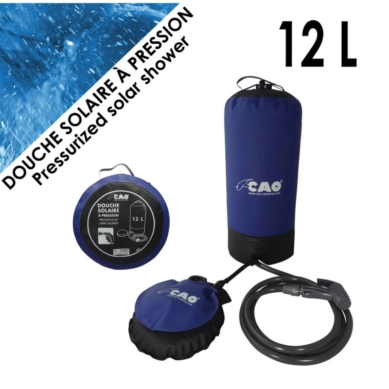Douche portable de 12 litres avec pompes pied et système de pression et chauffe solaire, ce matériel CAO OUTDOOR est parfait au camping, camping-car ou en bateau.