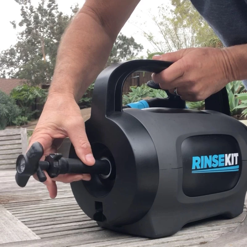 Si vous avez accès à un tuyau d’arrosage de jardin ou à un robinet d’eau domestique, la pompe n’est pas nécessaire, car l’eau remplie par ce biais sera déjà sous pression. La pompe est utile quand vous souhaitez remplir votre douche portable RINSEKIT Pod ou Plus avec une gourde ou une carafe d’eau, permettant de mettre sous pression le RINSEKIT.