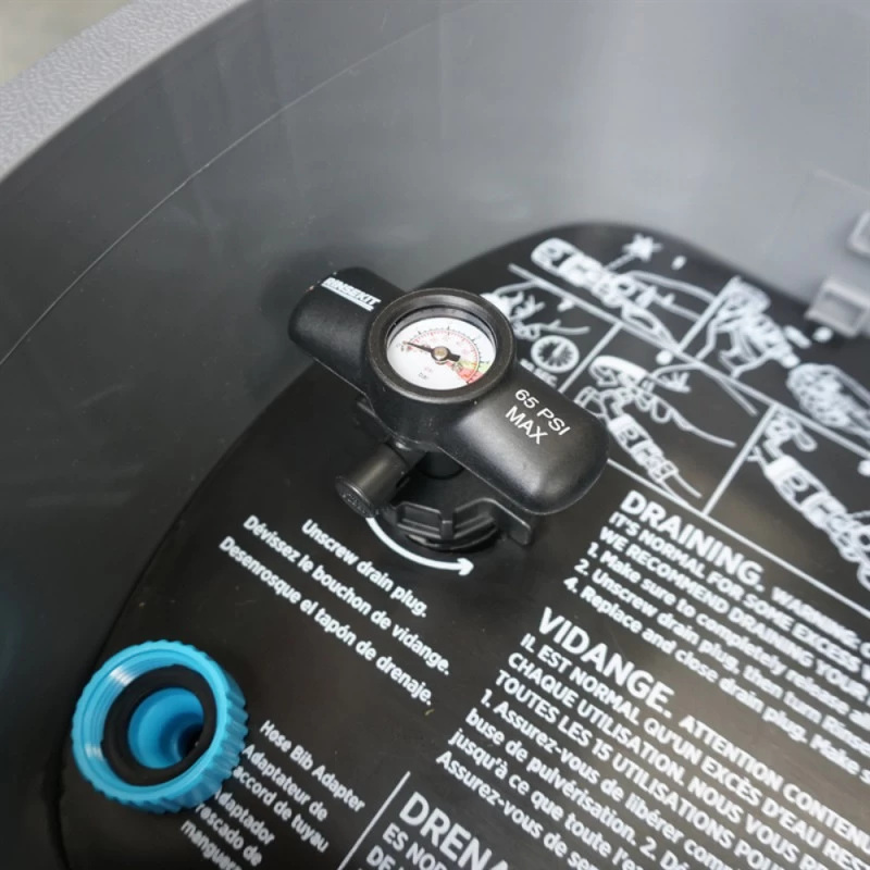 C’est très simple : sur votre RINSEKIT Pod, dévissez le bouchon situé sur le côté. Placez le RINSEKIT à la verticale et remplissez-le d’eau avec l’entonnoir fourni avec la pompe. Ceci fait, vissez la pompe à la place du bouchon et pompez jusqu’à la pression recommandée de 4,4 bar ou 65 PSI. C’est prêt !