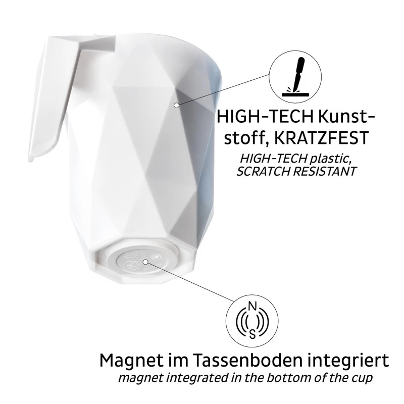 Vaisselle de haute qualité de la marque SILWY, la tasse magnétique est design et fabriquée en plastique de haute qualité. Sous la tasse, il y a un support magnétique qui vient s’aimanter facilement sur le pad autocollant.